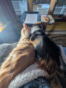 I have been editing from the comfy chair in my office today, and all the cats have joined me. Firefly, remains as she was, under the table next to the chair. Tali made several really creative attempts to sit with me in the chair, but just couldn’t make it work, whereupon she retired to Trooper’s box on the edge of my desk. Rook came in so quietly, I didn’t know he was with me, until I got up and found him curled in Sprite’s big fluffy cat ring, where he can keep an eye on me, and still enjoy the warmth coming off of the baseboard heater.
