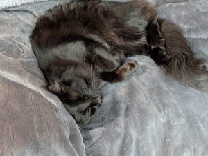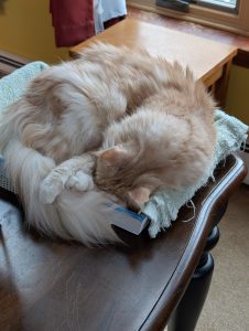 I also learned that I need to find a source for the particular fuzzy little balls that Rookie dotes on and then hides so effectively I can’t find any to throw for him, leading to Sadness of the Tiny, Abused Coon Cat variety.